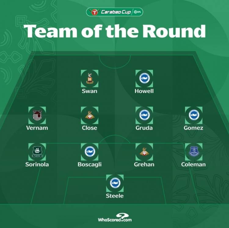 联赛杯第2轮最佳阵:布莱顿5人在列,格林斯比中场维尔南入围